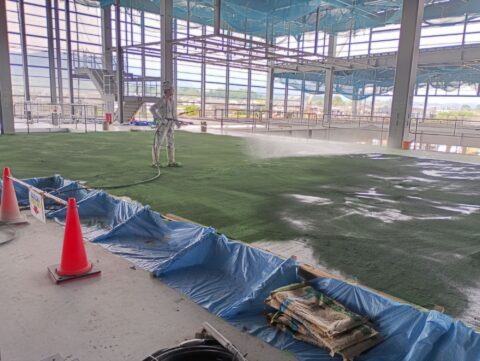 水を散布しながら鏝で刷り込んでいきます。